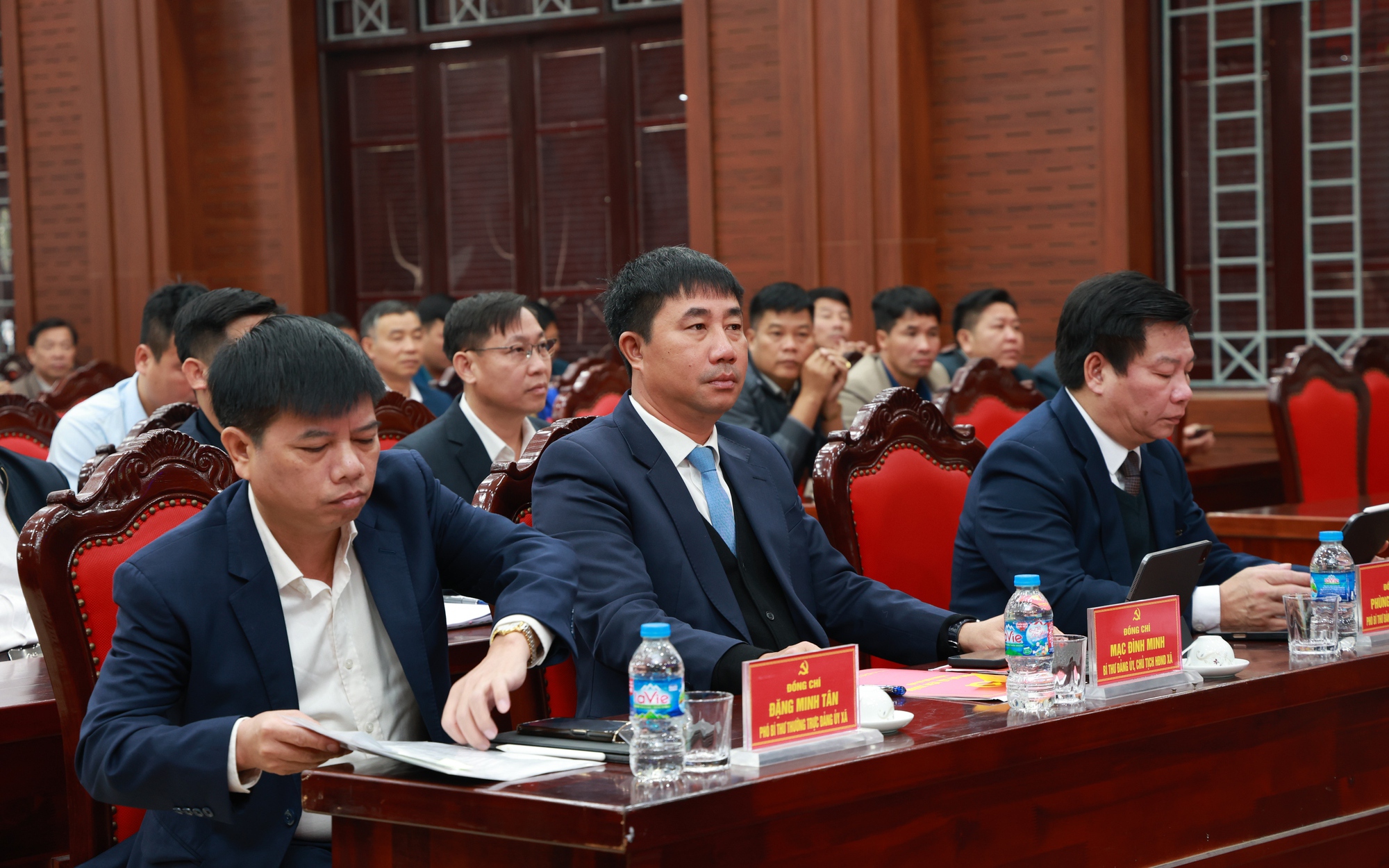 Đồng chí Mạc Đình Minh – Bí thư Đảng uỷ, Chủ tịch HĐND xã; đồng chí Đặng Minh Tân – Phó Bí thư Thường trực Đảng uỷ xã; đồng chí Phùng Khắc Sơn – Phó Bí thư, Chủ tịch UBND xã dự chủ trì hội nghị.