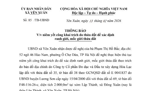 UBND xã Yên Xuân niêm yết công khai trích đo thửa đất để xác định ranh giới, mốc giới đối với thửa đất số 69, tờ bản đồ F48-116-26-c, diện tích 2.000,0m2 tại xóm Lập Thành, xã Đông Xuân (thôn Lập Thành, xã Yên Xuân, TP Hà Nội).