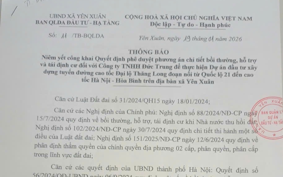 Thông báo: Niêm yết công khai Quyết định phê duyệt phương án chi tiết bồi thường, hỗ trợ và tái định cư đối với Công ty TNHH Đức Trung để thực hiện Dự án đầu tư xây dựng tuyến đường cao tốc Đại lộ Thăng Long đoạn nối từ Quốc lộ 21 đến cao tốc Hà Nội - Hòa Bình trên địa bàn xã Yên Xuân